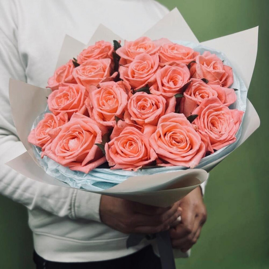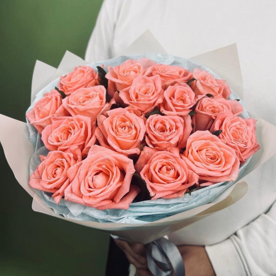 На фото букет из 17 коралловых роз. В составе: роза 17 шт, дизайнерская упаковка 2 шт, атласная лента 1 шт, . Все цветы свежие и ароматные, букет красиво оформлен и отлично подходит для подарка. Доступна доставка цветов или самовывоз.