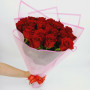 На фото букет из 21 бордовой розы. В составе: роза 21 шт, дизайнерская упаковка 1 шт, атласная лента 1 шт, . Все цветы свежие и ароматные, букет красиво оформлен и отлично подходит для подарка. Доступна доставка цветов или самовывоз.