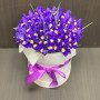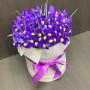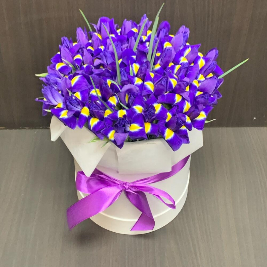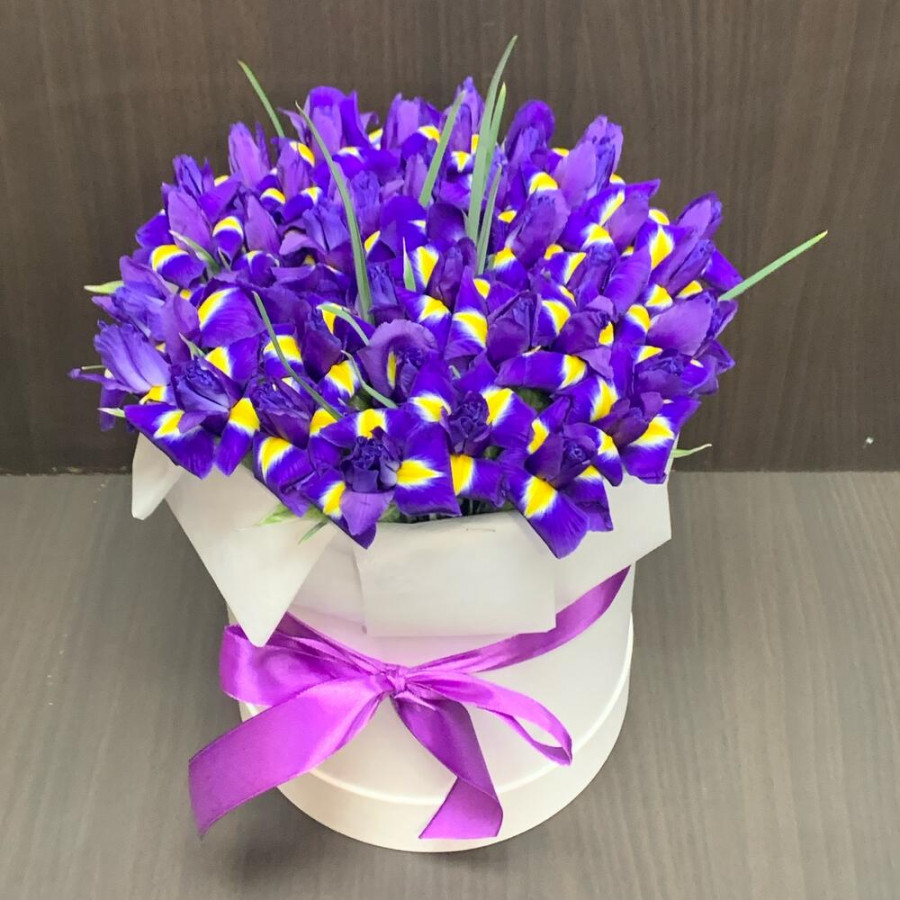 На фото 51 фиолетовый ирис в шляпной коробке. В составе: ирис 51 шт, оазис флористический 2 шт, шляпная коробка (l) 1 шт, атласная лента 1 шт, . Все цветы свежие и ароматные, букет красиво оформлен и отлично подходит для подарка. Доступна доставка цветов или самовывоз.